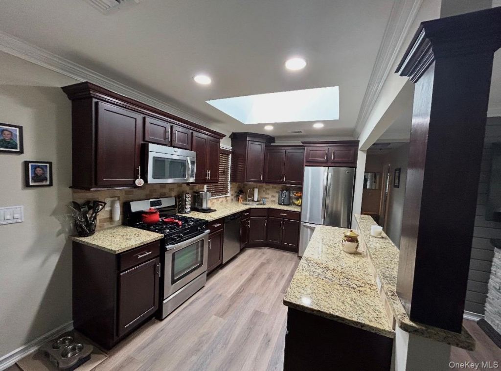 Welcome to this beautifully maintained ranch offering comfort, style, and thoughtful upgrades throughout. The bright and inviting sunroom is a true highlight featuring a beamed ceiling, twelve windows, and two ceiling fans with lights, creating the perfect space to relax year-round with its own heating and air conditioning unit. The kitchen features granite countertops, soft-close cabinetry, and a large skylight that fills the space with natural light. Enjoy the luxury of a generous walk-in closet with plenty of space for clothing, shoes, and accessories in the primary bedroom. Move right in and enjoy effortless living in this turn-key home-where pride of ownership shines in every detail. Close to the train and parkway.